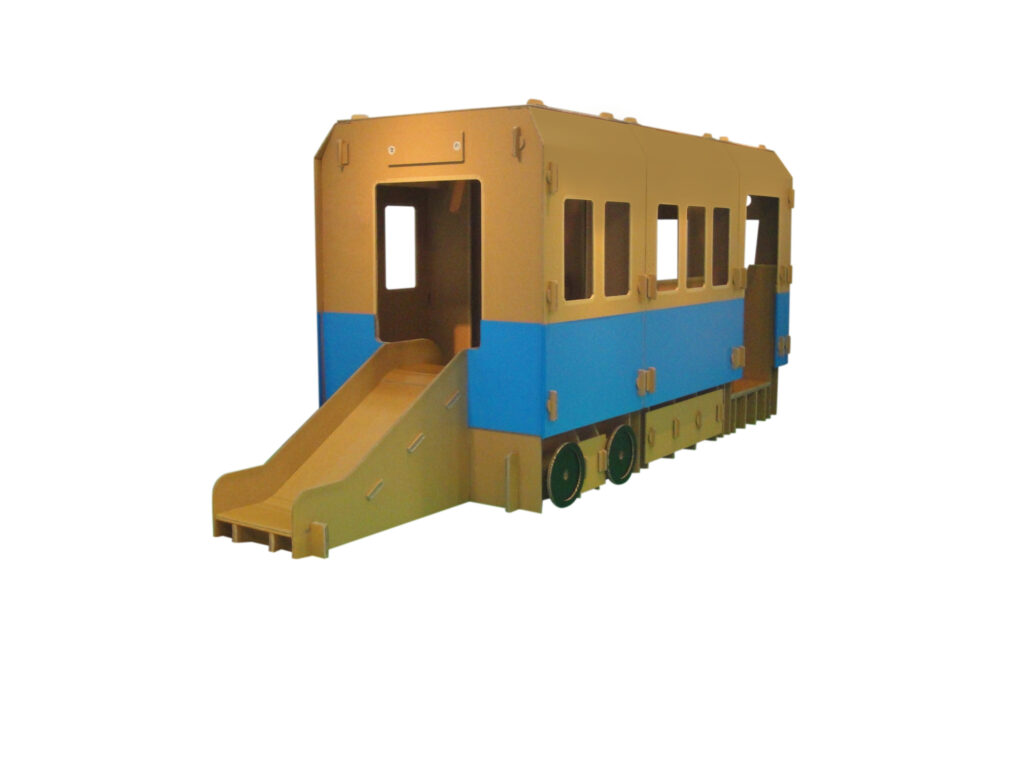 ダンボールでできた電車の中に入ったり、すべり台で遊ぼう❗
